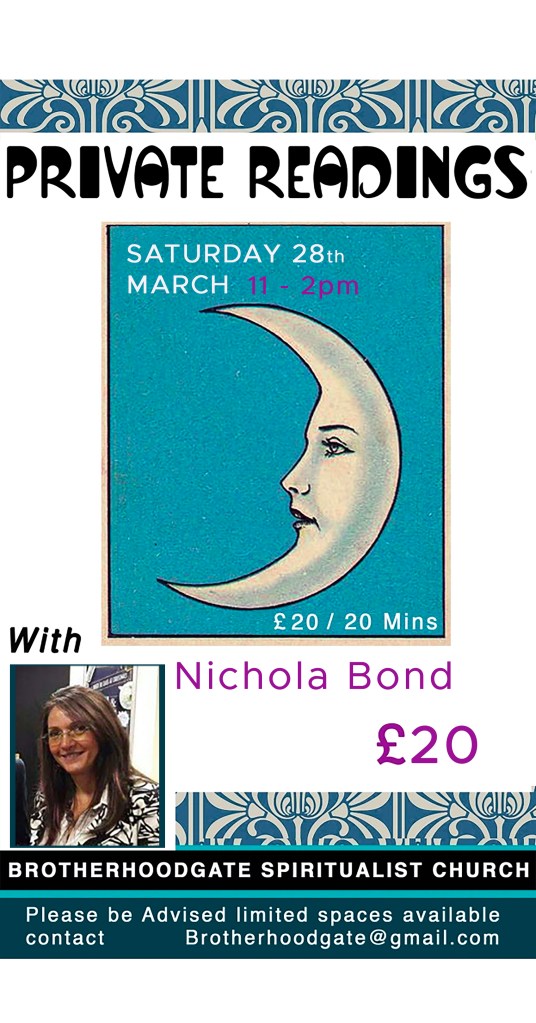 Sat 28th March —11 —2pm – Private Readings with Nicola Bond